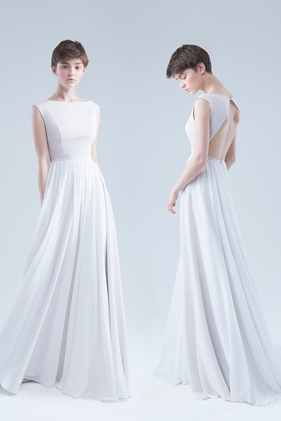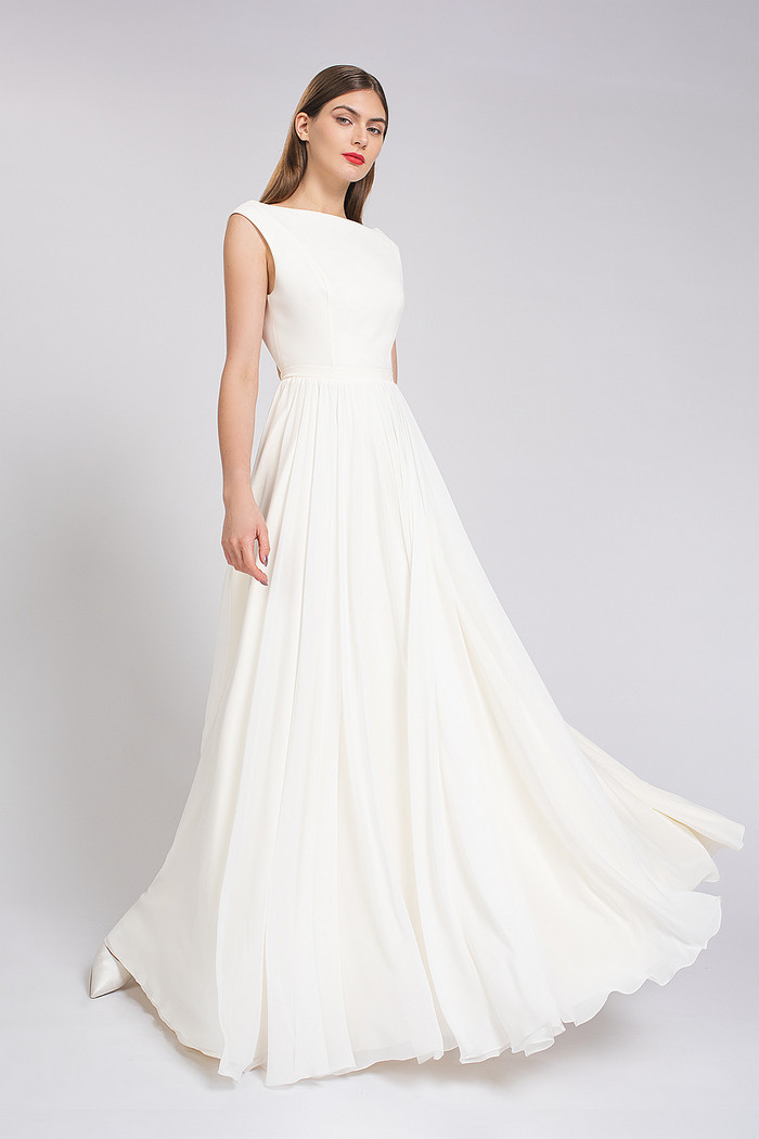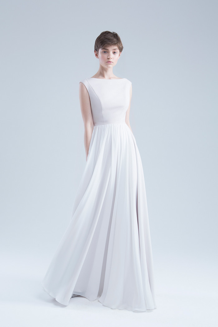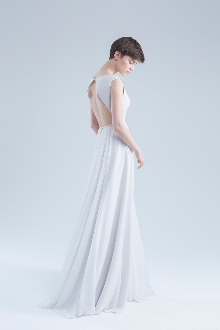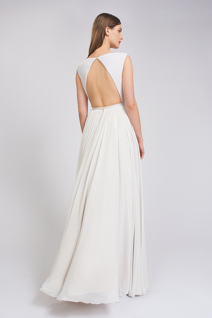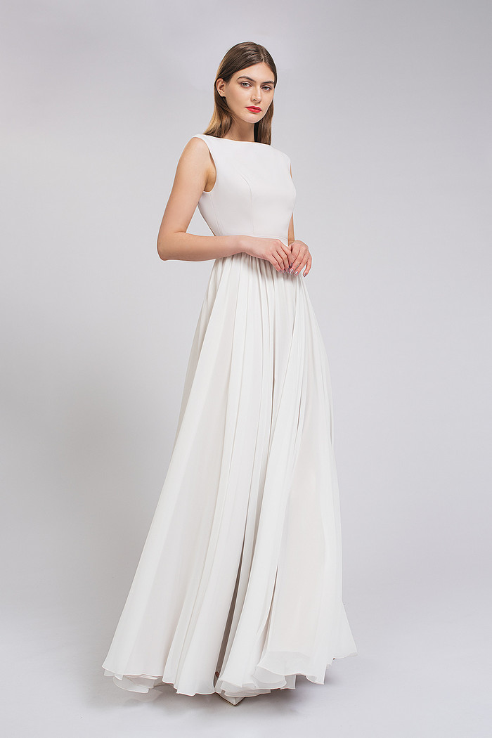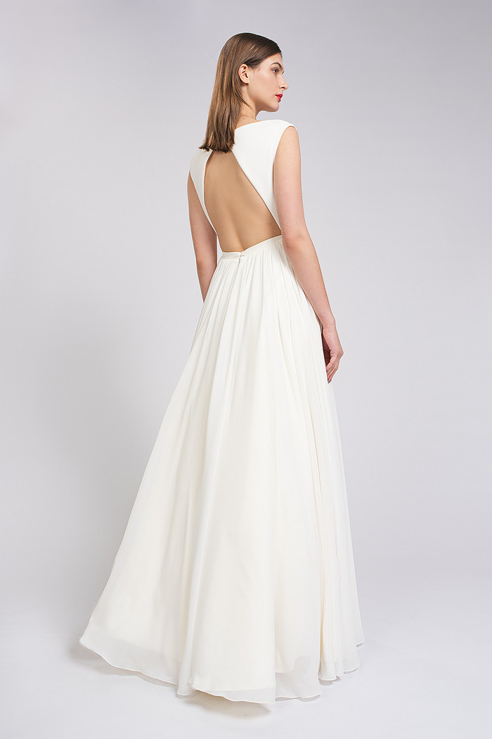 Стильное платье с мягким лифом из стрейч-атласа с открытой спинкой и юбкой из атласа и шифона