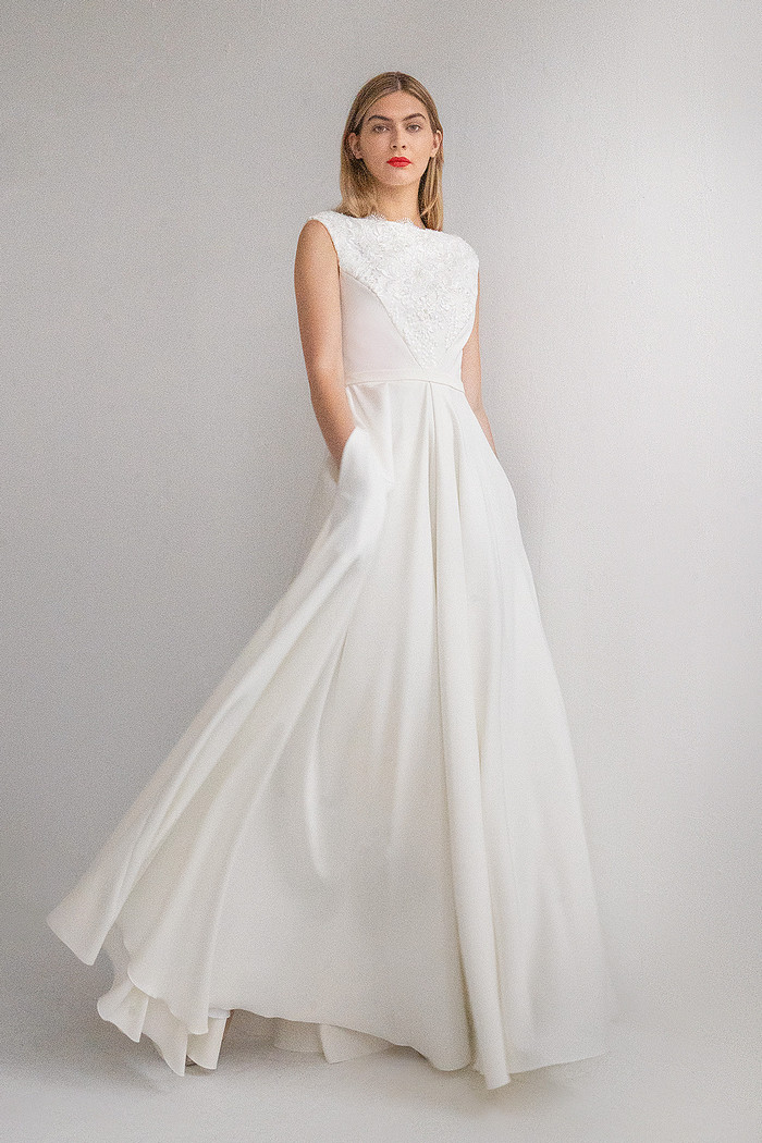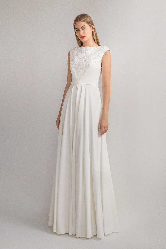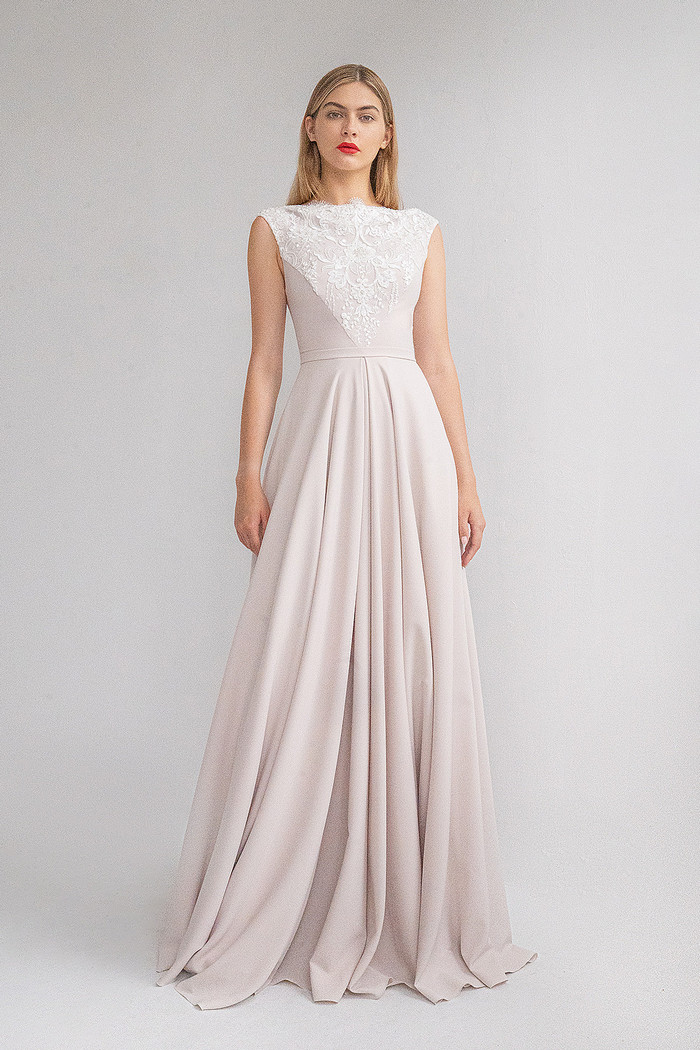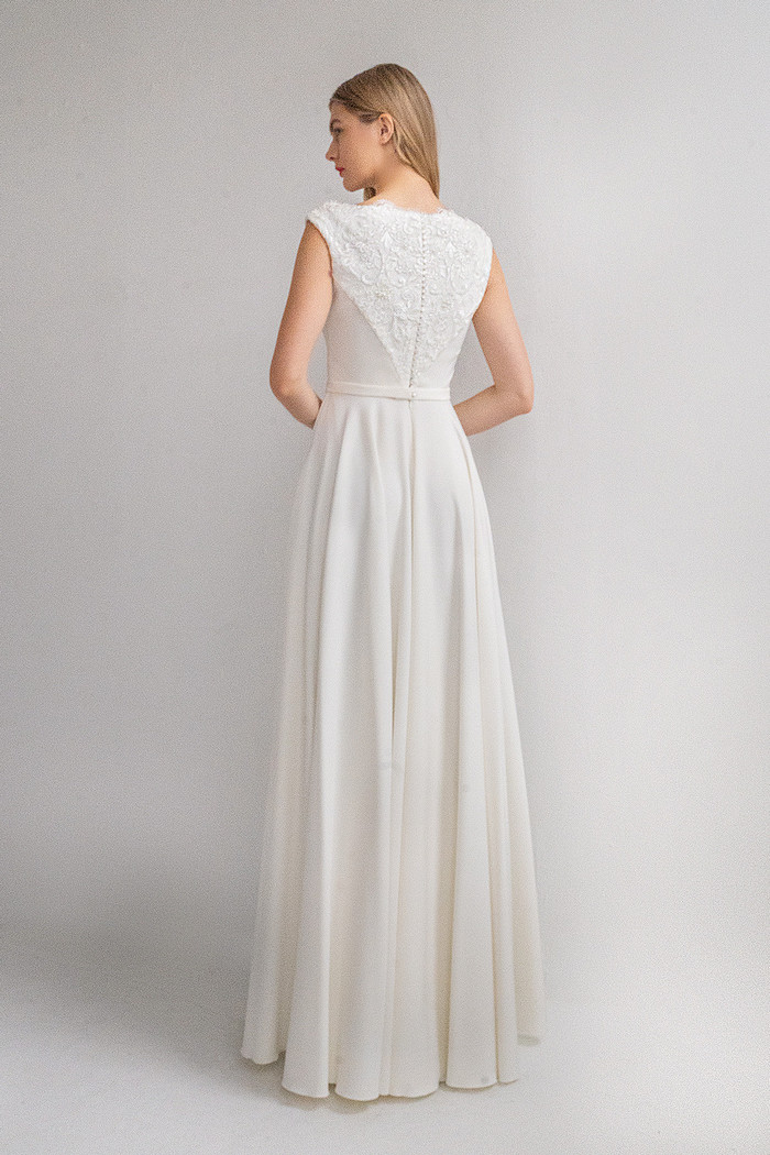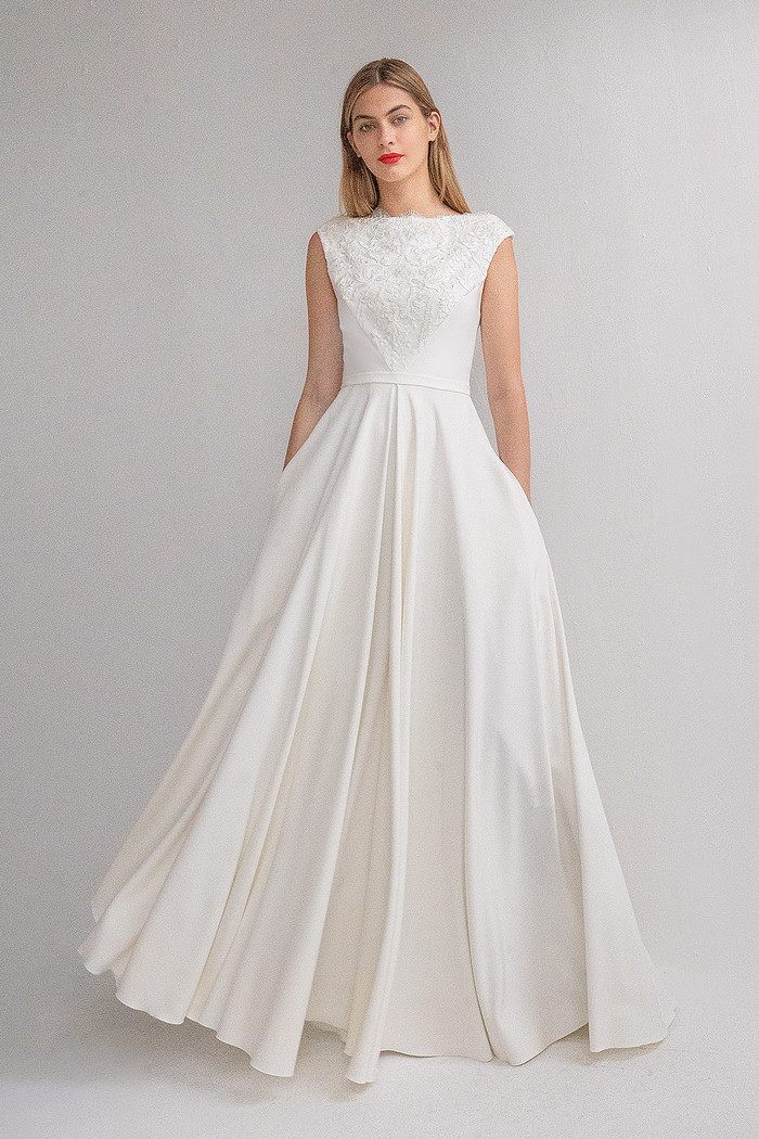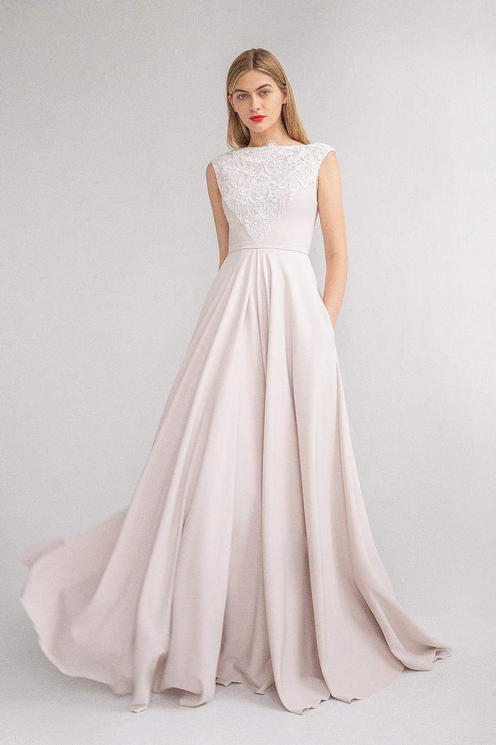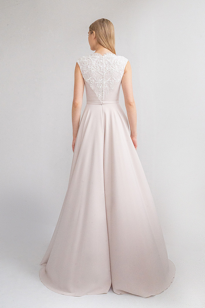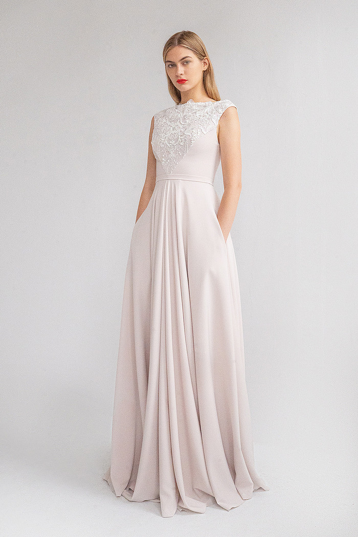 Безкорсетное платье из стрейч-атласа с длинной юбкой с карманами. Лиф платья декорирован расшитым бисером и кружевом шантильи.