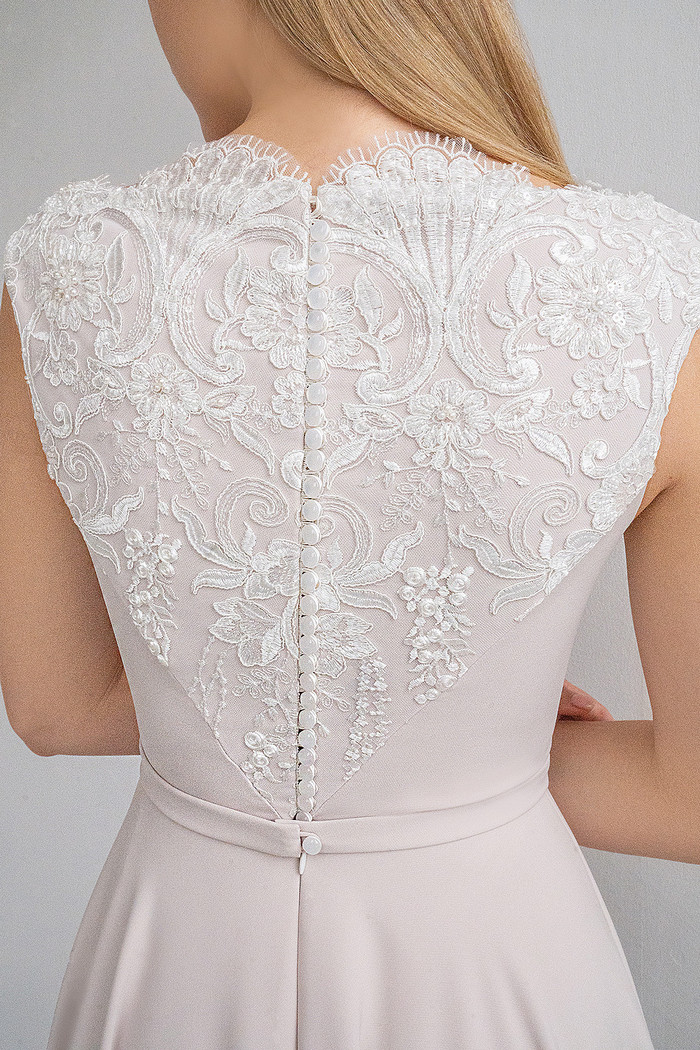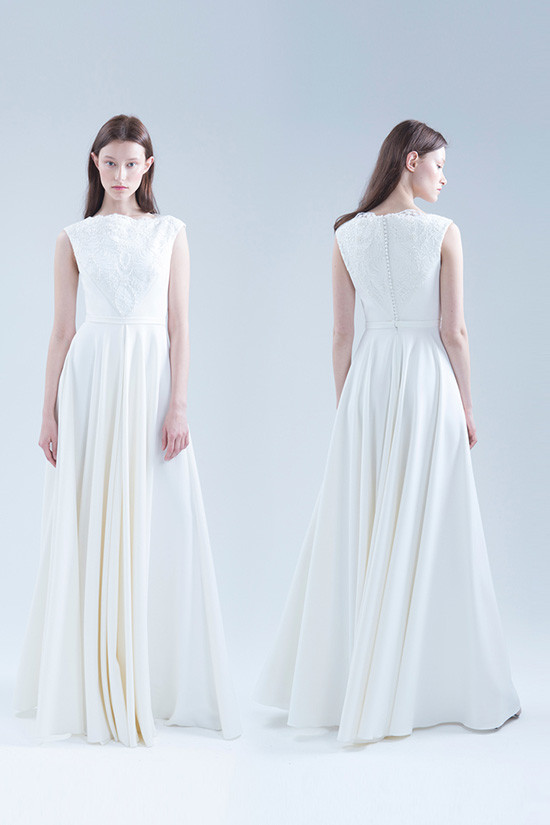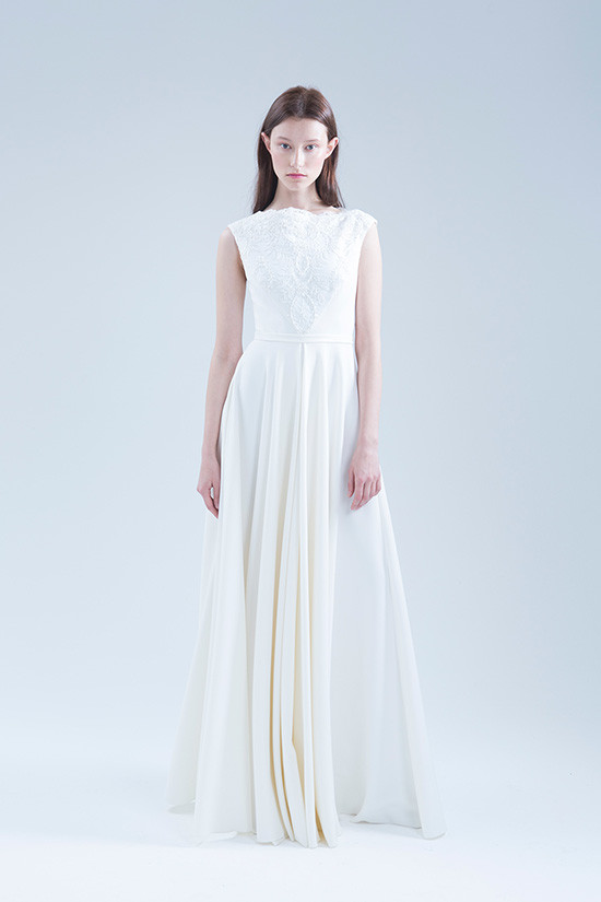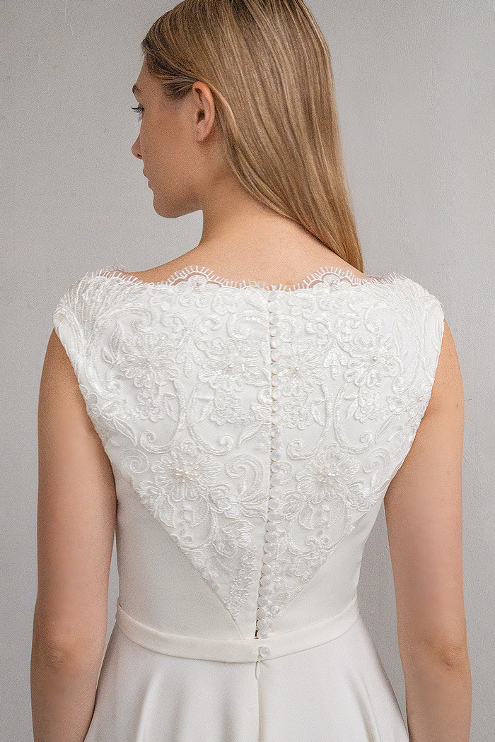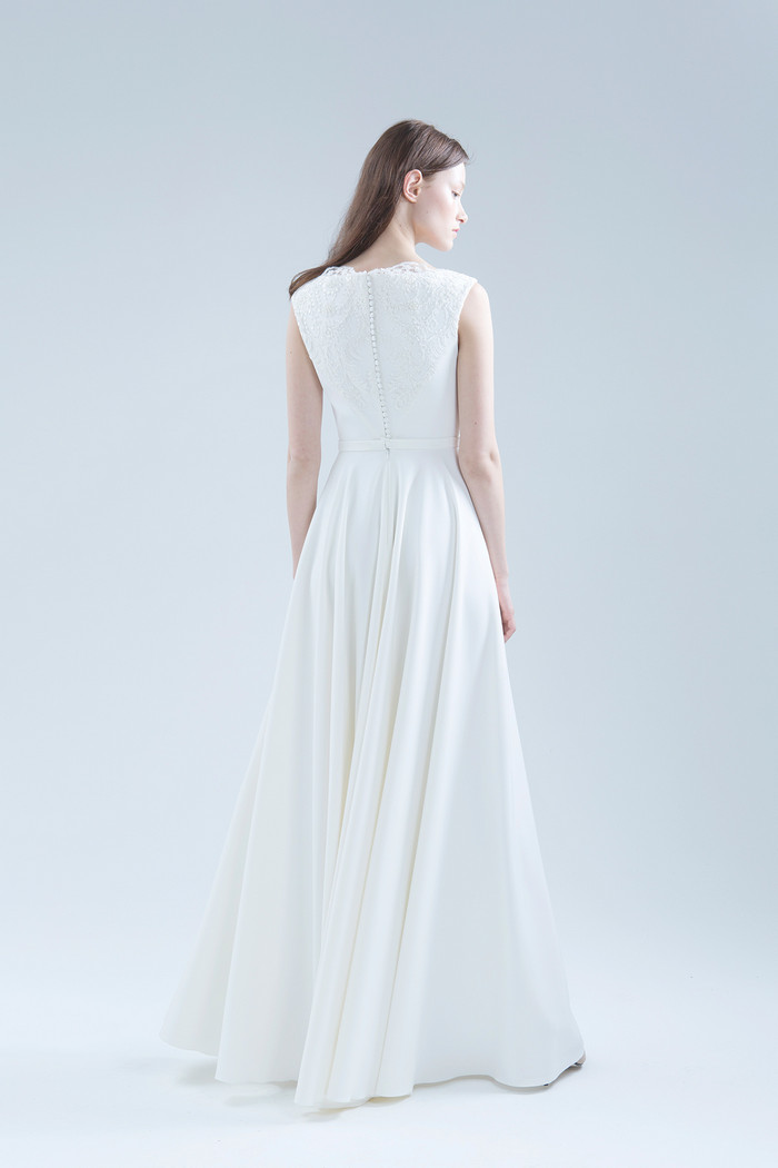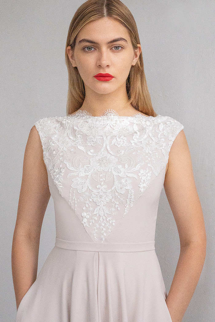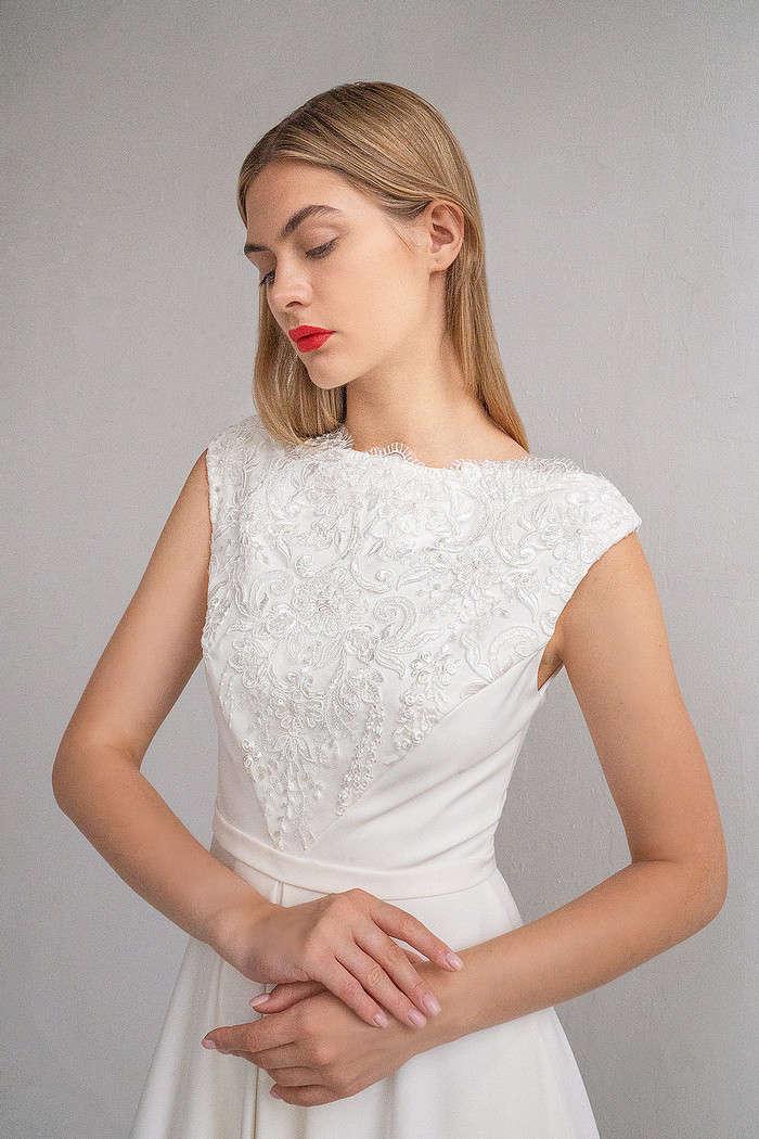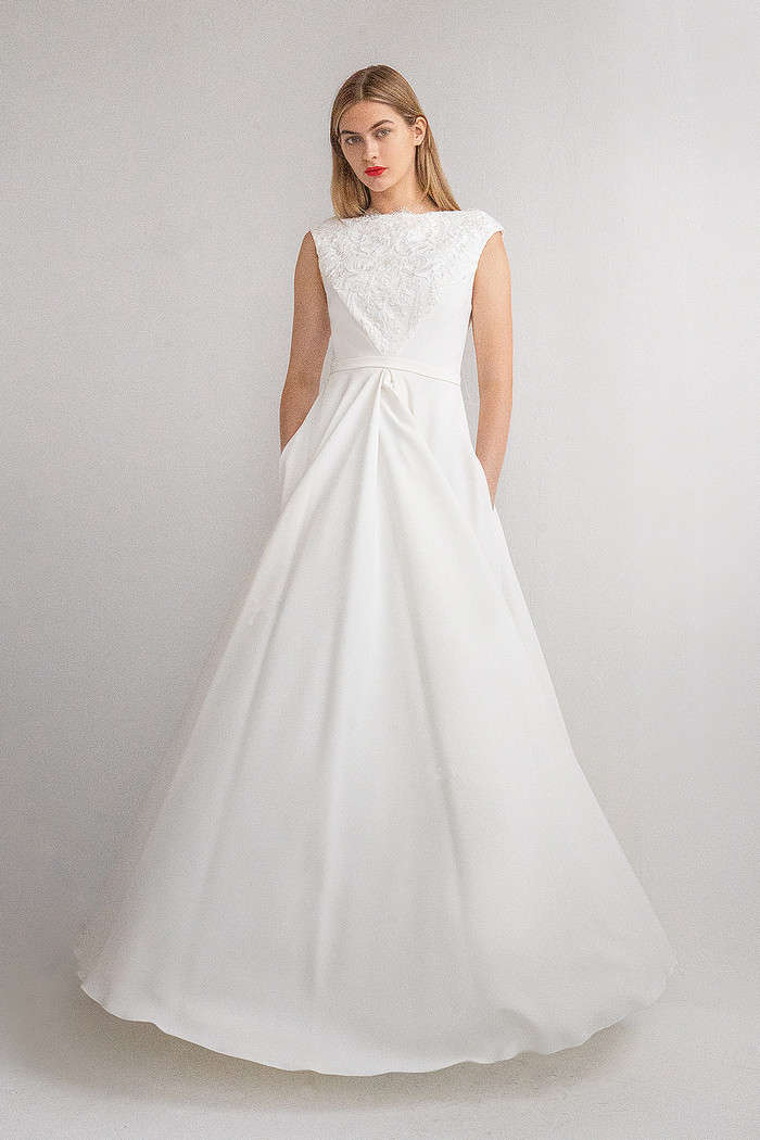 Безкорсетное платье из стрейч-атласа с длинной юбкой с карманами. Лиф платья декорирован расшитым бисером и кружевом шантильи.